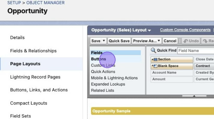 Click Buttons and drag the new button into the Opportunity Detail area. Click Save.