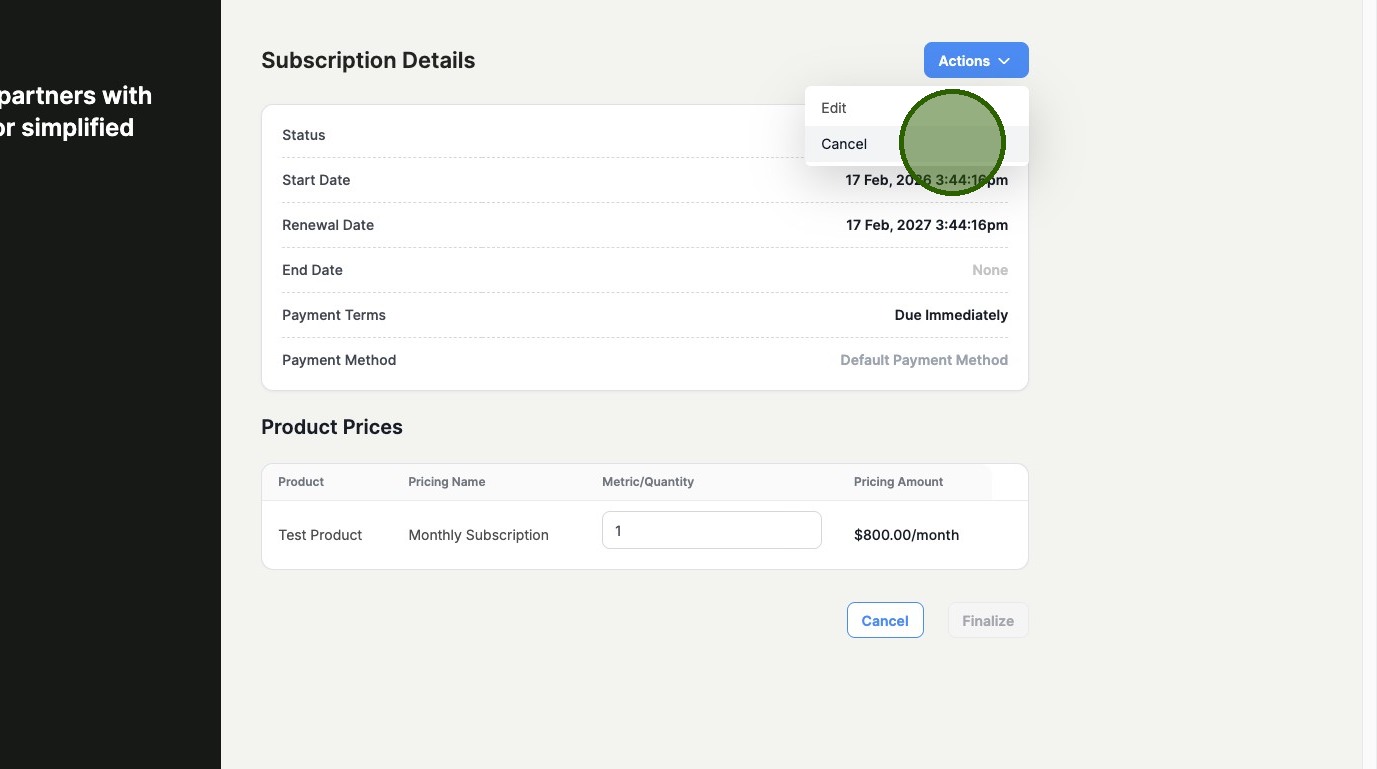 Click View in the "Subscriptions" section to see your active subscriptions. From the subscription details page, you can use the Actions menu to Edit or Cancel your subscription.