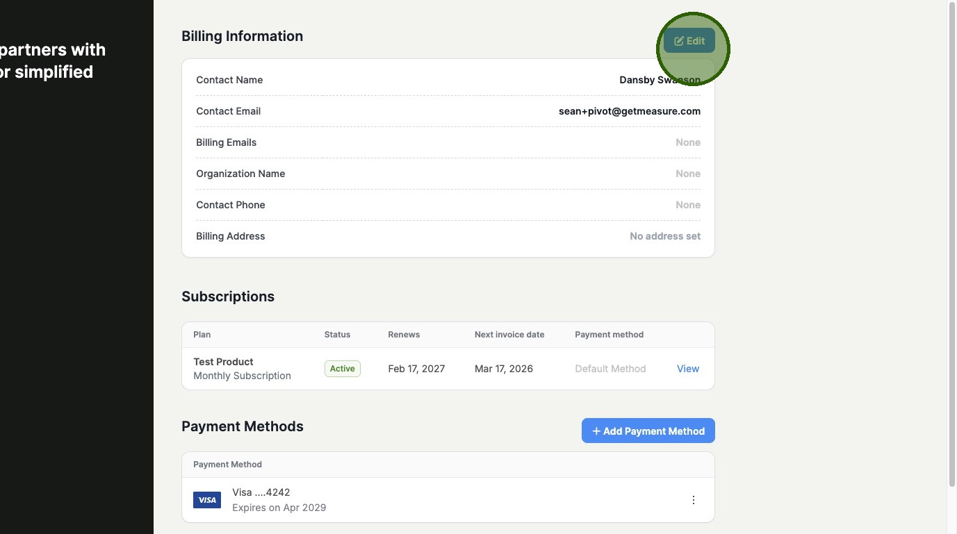 Edit Billing Information: Click Edit to update your contact name, email, or other details.