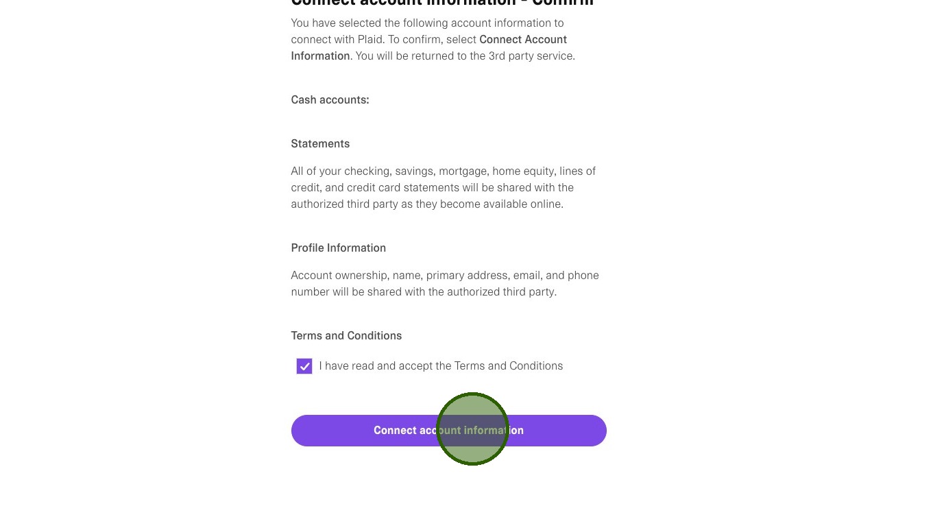 Review the terms and conditions, accept them, and click Connect account information to authorize the link.