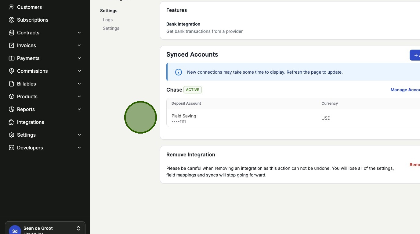 Click Finish without saving to complete the process. Your Plaid integration is now connected and will appear in your settings.