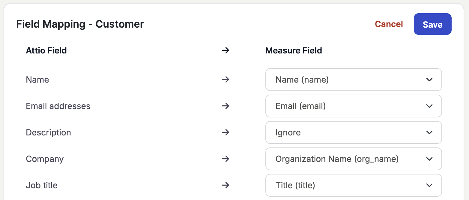 Field mapping connects Measure objects to their Attio counterparts. Getting this right is the foundation of a reliable sync.