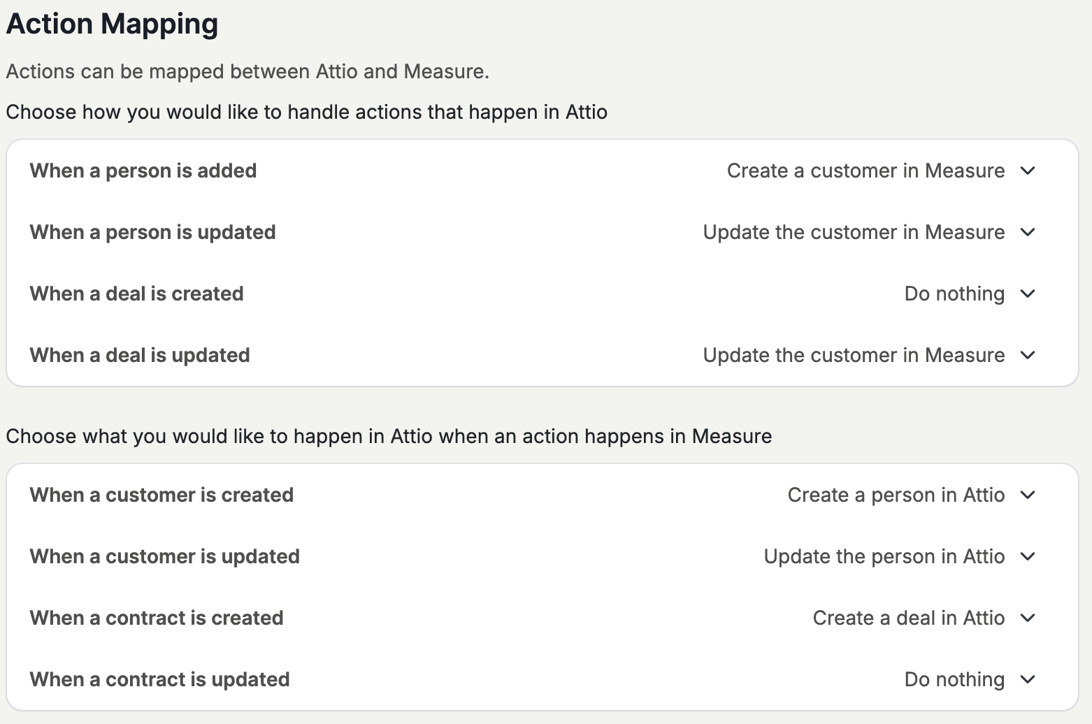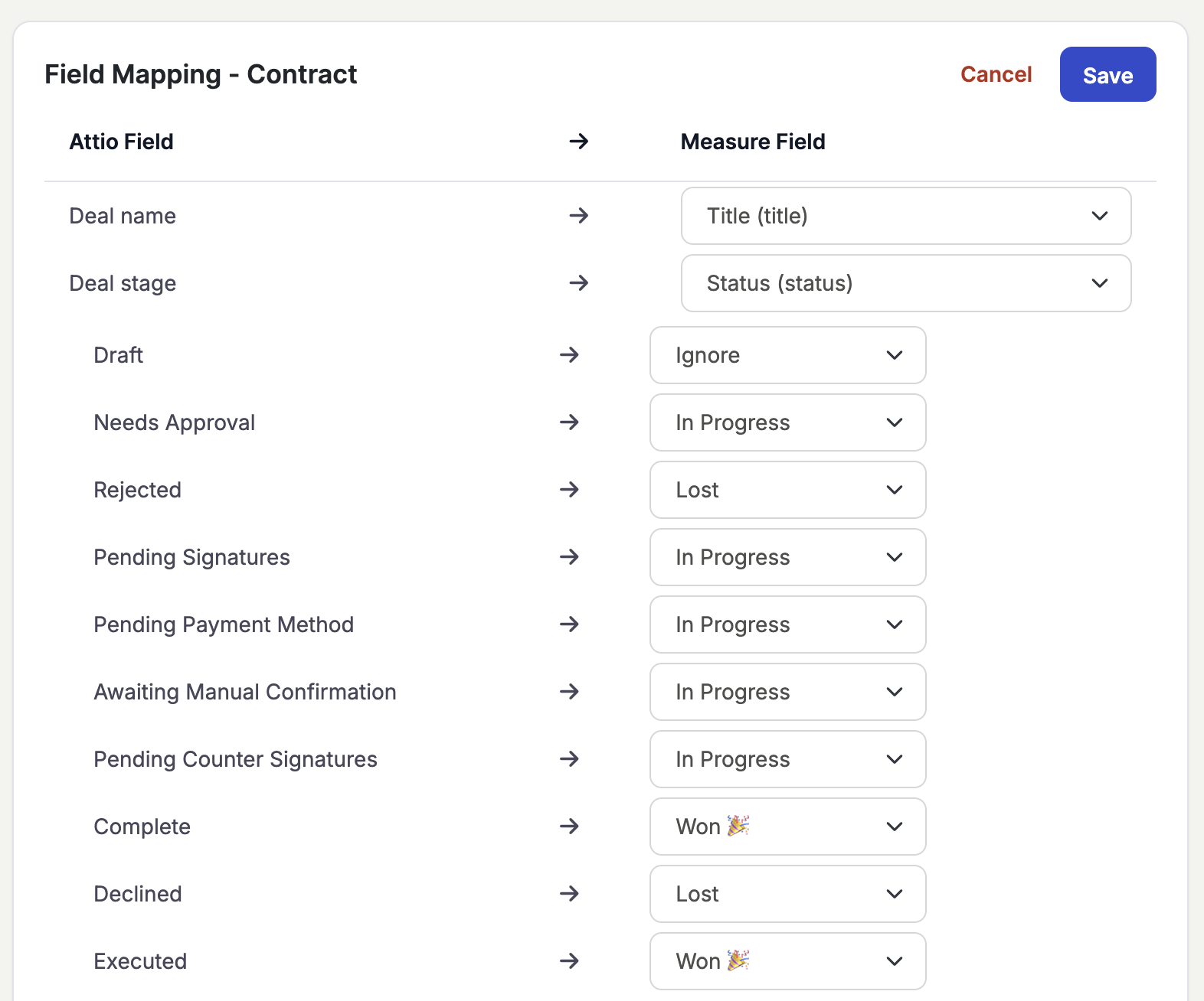 Tip: Map every Measure contract status to an Attio stage. Unmapped statuses can cause sync failures or incomplete deal records.