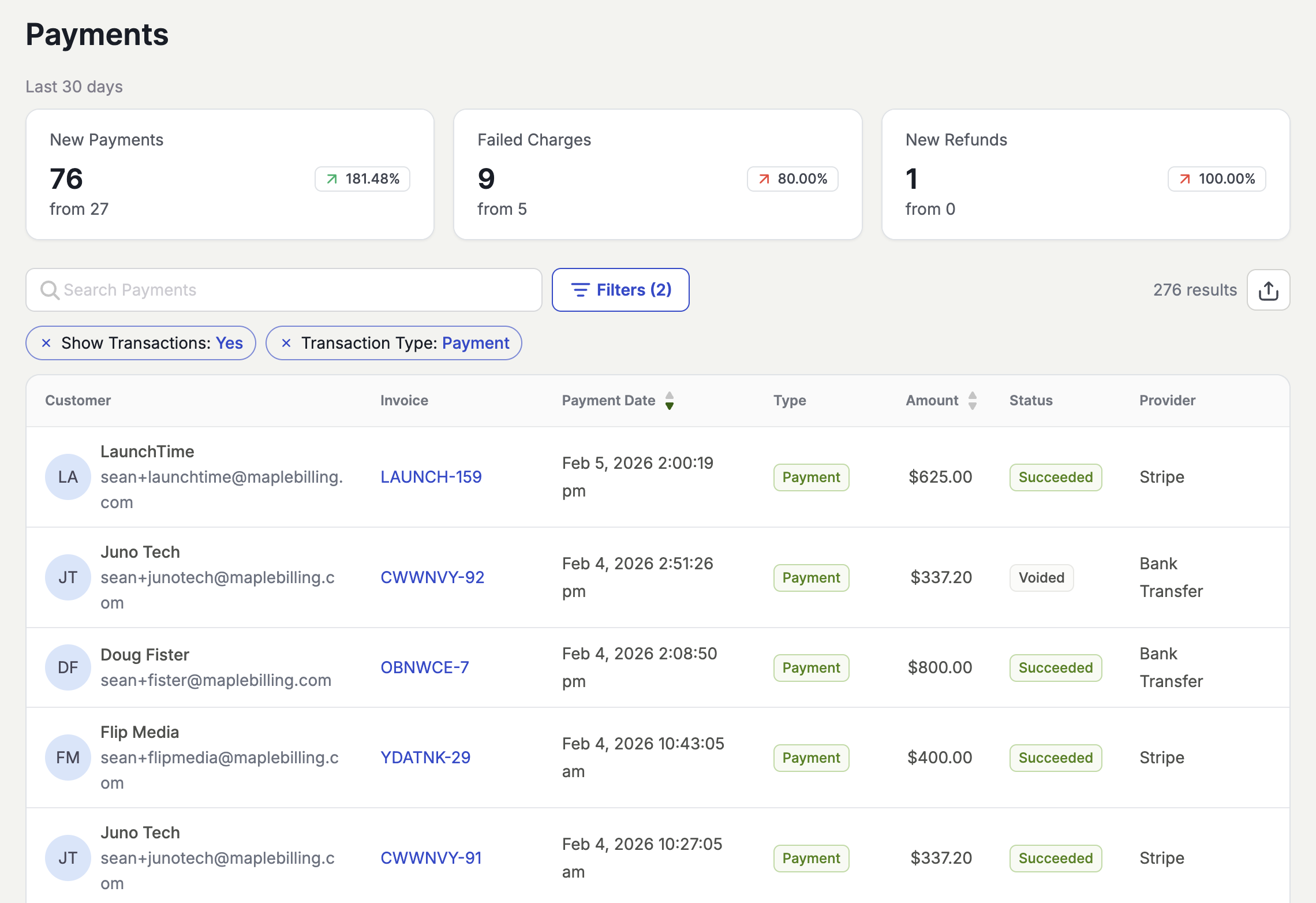 The page lists all your payments with high-level aggregations over the last 30 days. You can also filter payments by: Status, Currency, Provider Type, Transaction Type, and Payment amount. You can also choose to show or hide Stripe Connect transactions.