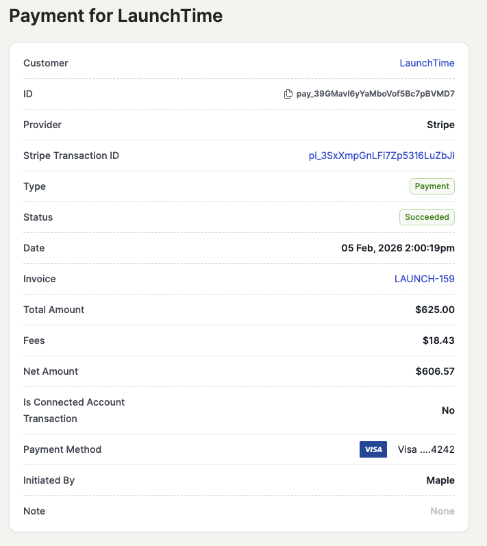 Measure integrates with third-party payment providers for payments and refunds. Payment transactions are automatically associated with the invoice and trigger the appropriate state changes for the invoice. Measure currently supports many payment provider integrations.