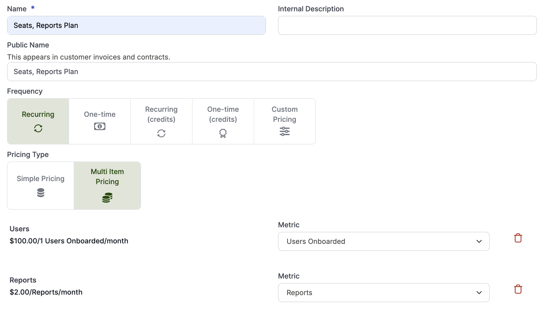One or more metrics can then be added to a single product pricing as separately priced components. This allows you to offer plans that contain components of different billing types.