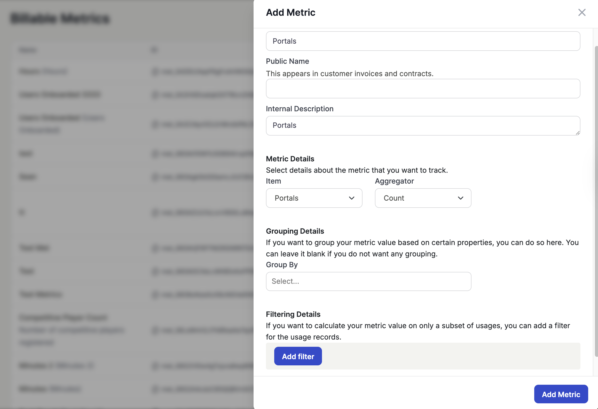 Billable metrics are composed of filters and aggregation clauses. Think of these as WHERE and GROUP BY SQL clauses, respectively. For example, you can create a billable metric for the COUNT() of API calls based on the following usage-based event