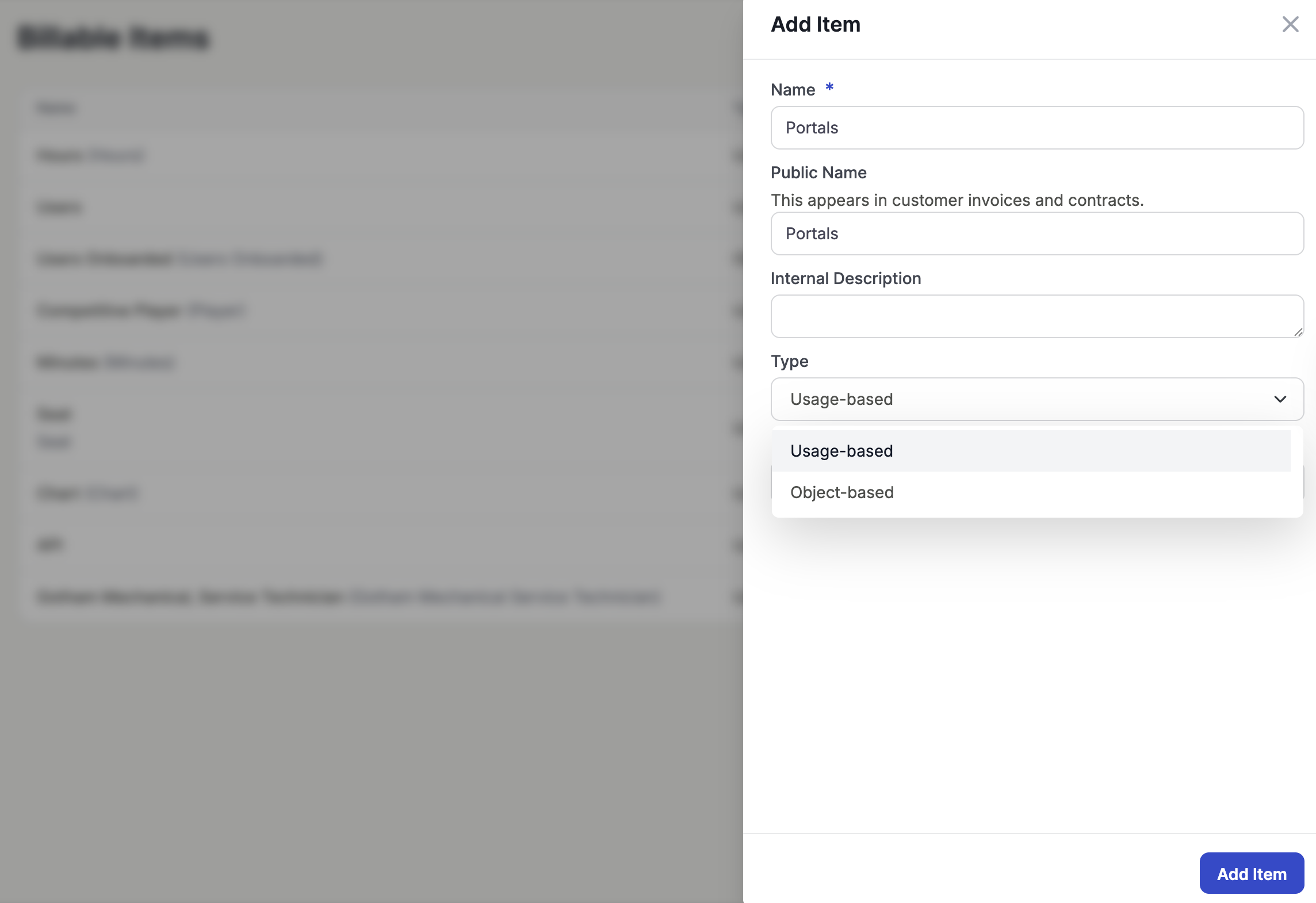 Billable items are the core unit for charging a customer through Measure. This is a standard license, a usage-based item such as API calls or an object such as user seats. Billable items can be set up through the Measure web application. Measure provisions “License” items by default. For usage-based and object-based items, a billable metric needs to be defined before setting up pricing.