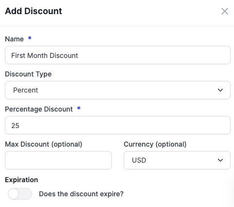 Measure enables you to create customized discounts based on specific products, plans, or even item prices that are used to bill usage on an invoice. These discounts can be percentage-based or amount-based, with or without an expiration date. These discounts can be auto-created on contract or subscription creation as well.